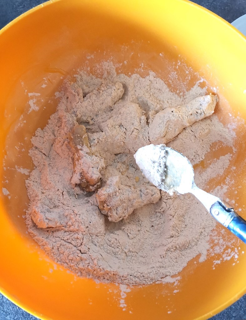 Pendant ce temps, nous allons préparer la panure. Dans un saladier, mélangez une belle quantité de farine (assez pour recouvrir tous vos morceaux de poulet) avec toutes les épices à panure.