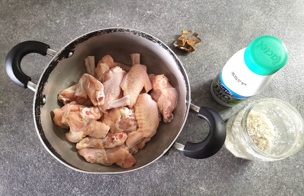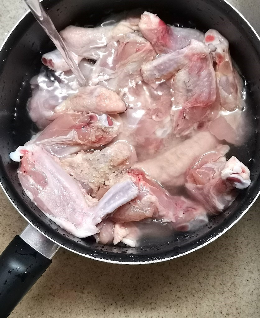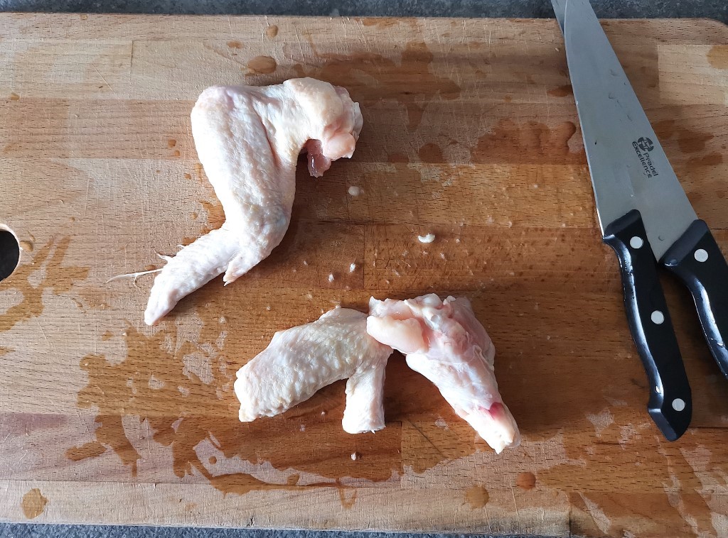 Commencez par nettoyer et découper vos ailes de poulet en 2 comme sur la photo. Lavez le poulet avec du gros sel et de l’eau.