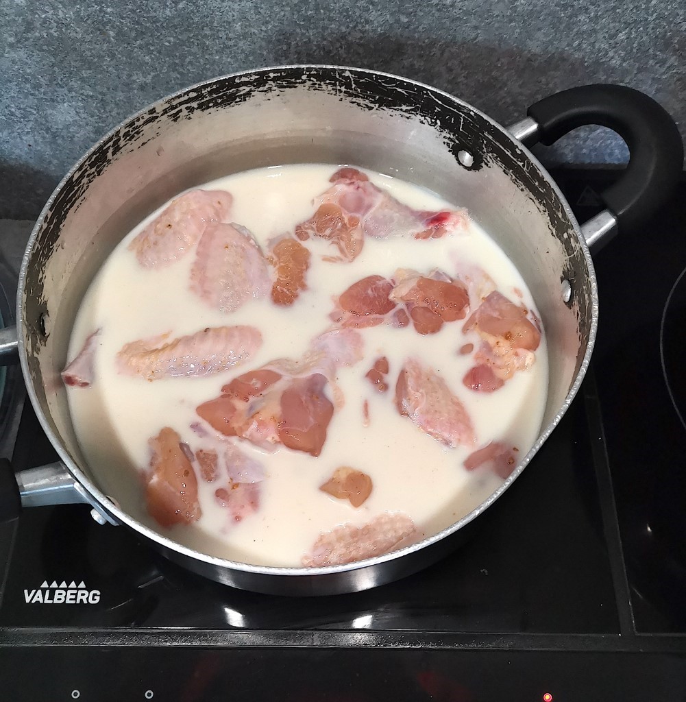 Faites bouillir les ailes de poulet dans du lait, auquel vous rajouterez 2 cubes Maggie ou Kub’Or et un peu de gros sel, environ 20 mn le temps que le poulet soit bien cuit. N’oubliez pas de remuer régulièrement pour ne pas que le poulet accroche au fond de la casserole.