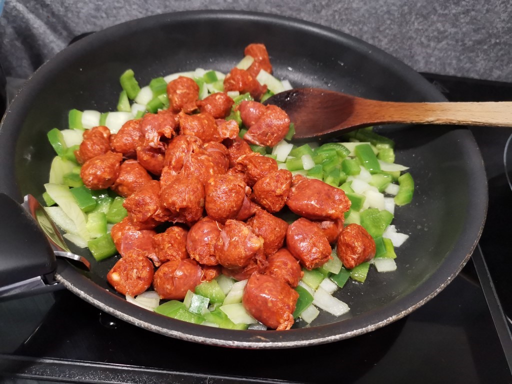 Faites revenir l’oignon et de poivrons dans un filet d’huile pendant 5 mn environ. Puis rajoutez-y vos merguez coupées en rondelles assez épaisses, un peu de sel et l’ail semoule ou frais. Faites revenir une dizaine de minutes jusqu’à ce que les merguez soient bien cuites.