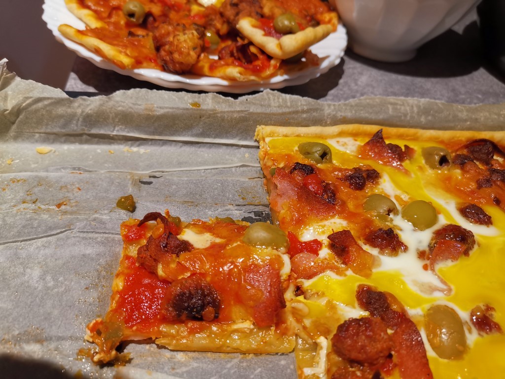 PS 2 : j’ai opté pour une pizza orientale revisitée, mais la magie de la pizza c’est que vous pouvez mettre ce que vous voulez dessus selon vos goûts et ce que vous avez sous la main.