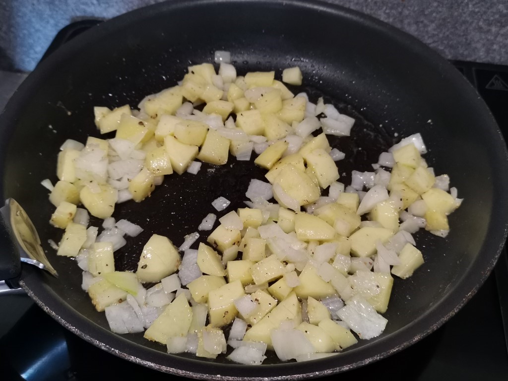 Coupez les pommes de terre en petit dés et émincez l’oignon. Salez, poivrez et ajoutez l’ail. Faites-les revenir 5 minutes avec un filet d’huile.