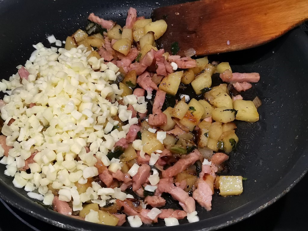 Ajoutez les lardons, puis le persil. Faites revenir jusqu’à ce que les lardons et les pommes de terre soient bien cuits.