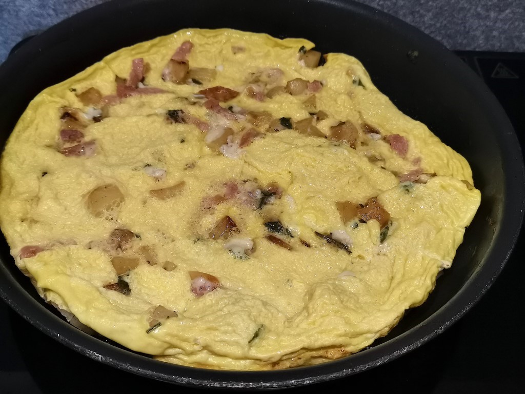 Pendant ce temps, battez les œufs en omelette avec un peu de sel. Rajoutez les dans la poêle par-dessus le mélange, couvrez et laisser cuire à feu doux.