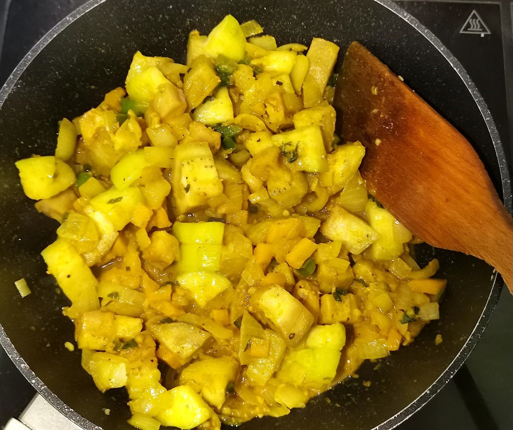 Pendant ce temps découpez votre courgette et votre aubergine en carrés plus gros. Rajoutez-les dans la poêle et laissez cuire 5mn.