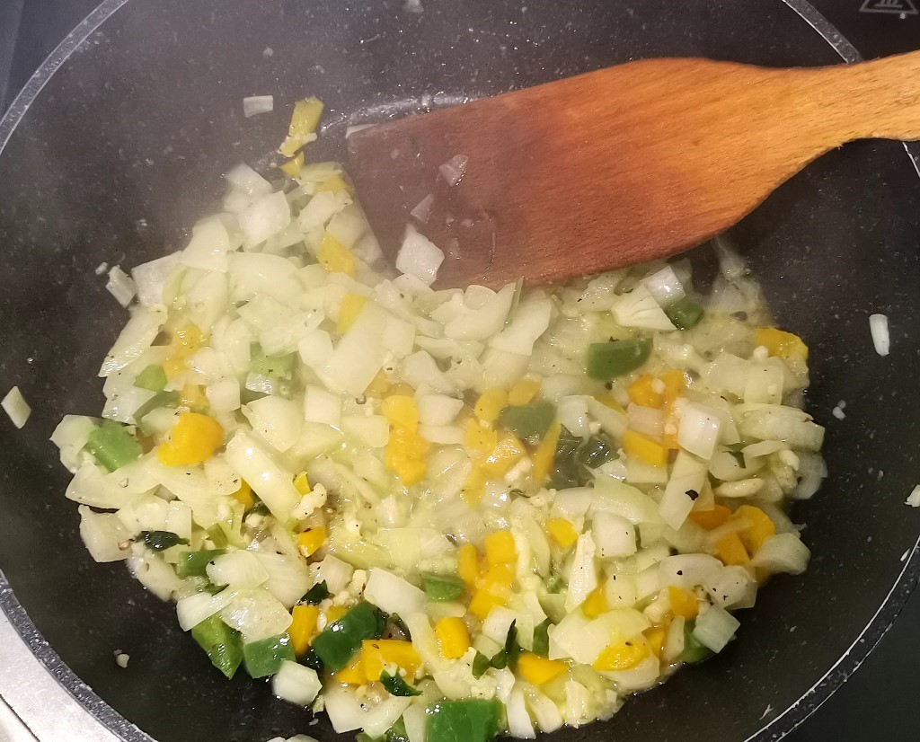Découpez vos oignons et poivrons en petits dés. Dans une poêle, faites-les revenir dans un fond d’huile d’olive jusqu’à ce que les oignons deviennent translucides. Ajoutez l’ail écrasé, le persil, du sel, du poivre, du cumin et du curcuma selon vos goûts.